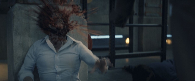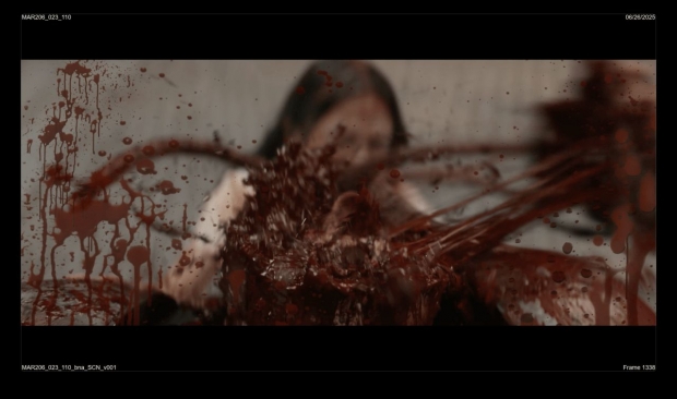 Miniatures were also created by the art department to use as reference. According to Heston, “We did scaled-down models based on the size ratio of what a little person looks like running across the floor, standing, or sitting at a table. Then there was the water tank work. How do we get the scale of the water to match her size when she's a real sized person that needs to be little? There were a lot of math considerations and planning with the art department and some of our other departments, like stunts with John Koyama, to make sure that the wirework was solid in the tank. Special effects had to make sure we had some cool atmosphere throughout the scenes. We wrapped a tank in black for when she's in the pipes, and wrapped a tank in white for when she’s in the toilet.” Noting key simulation work that was also done, Heston adds, “There was a lot of simulation work with the blood tendrils and big arc at the end where we had a huge wave of blood. Those were two of the biggest things onset that we dealt with.”