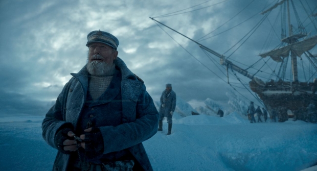 Other evocative color choices include the cold Arctic blue, expressed both in the icy snowscape around the stricken “Horisont” and in the uniforms of its crew. While Victor accents his outfits with red, his wealthy benefactor (who also happens to be Elizabeth’s uncle) Henrich Harlander (Christoph Waltz) favors warm browns and golds, symbolizing his wealth and decay, in a memorable shot on a corpse-strewn battlefield, picking up the orange glow of the surrounding fires.